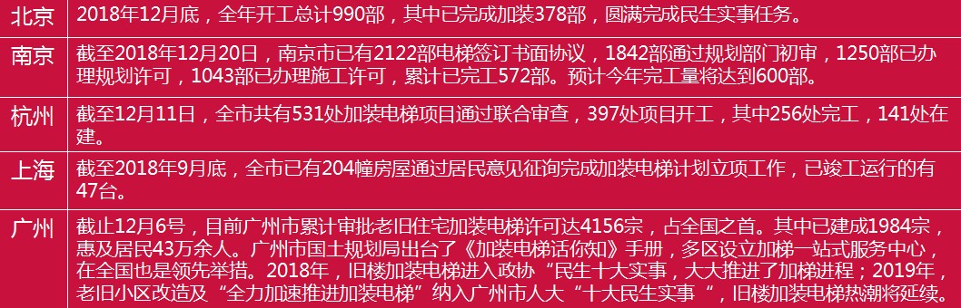 2018年两会政府报告首次提出“鼓励有条件旧楼加装电梯”,各地政府陆续出台旧楼加梯相关补贴及支持政策,使该市场需求出现爆发式增长。2018年全国大部分省出台了旧楼加装电梯政策指引,详细指出了旧楼加装电梯的技术要求,更有地方精简了旧楼加装电梯的程序,出台了旧楼加装电梯的补贴措施,有的省市出现了旧楼加装电梯服务中心,一系列的措施促进了旧楼加装电梯的完成。全国旧楼加装电梯工作开展力度较大的有广州、北京、南京、杭州等,各地审批及完工数据均出现巨增。以下为摘自各大平台及各市住建办、物业办的相关数据。
